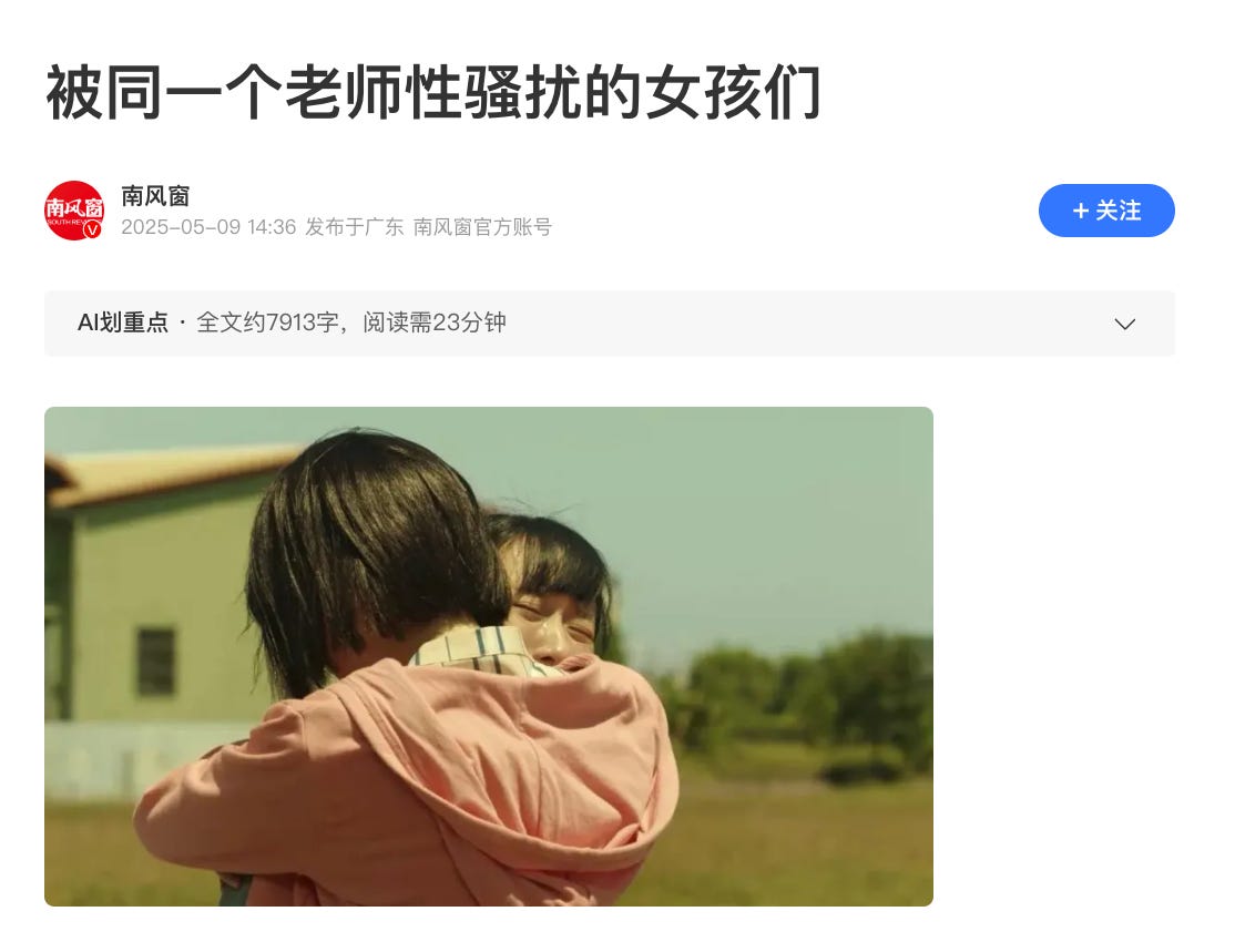 儘管《南風窗》最後自網站撤下報導〈被同一個老師性騷擾的女孩們〉,但仍可在廣州日報集團官方平台《廣州日報新花城》上閱讀全文。