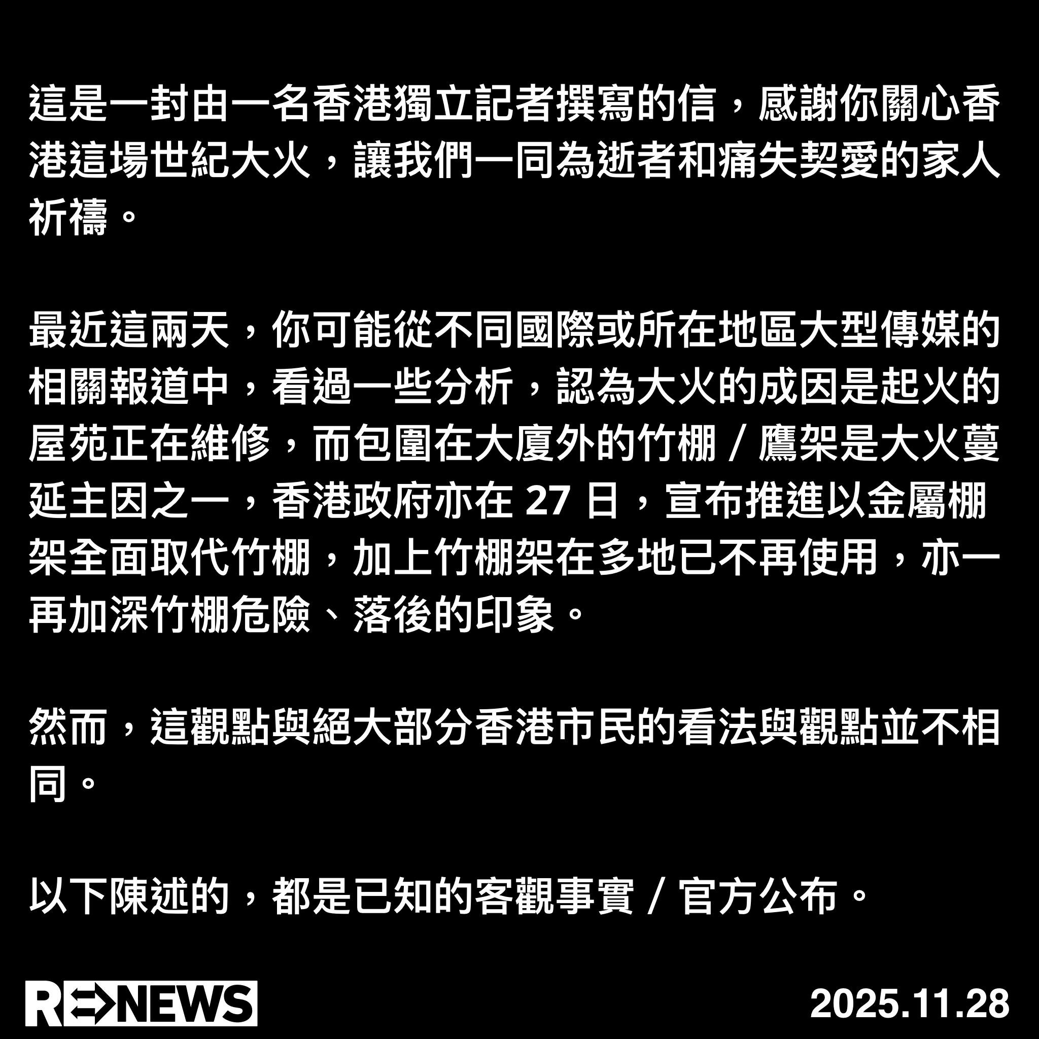 香港獨立媒體《ReNews》在11月28日刊出一篇說明,直言國際報導的觀點與多數香港民眾不同,並強調目前的官方調查未提及棚架材料,文末更申明撰寫這篇說明的動機:「對於外地朋友而言,可能會覺得竹棚被外地人誤會為元兇,無傷大雅,香港人不必緊張。但香港市民真正擔憂的,是竹棚被廣泛誤認為肇因,客觀上會轉移視線,模糊大火背後真正的問題:監察和制度的崩潰。」這篇說明先是刊出繁中、簡中及英文的版本,爾後也被翻成日文及韓文。