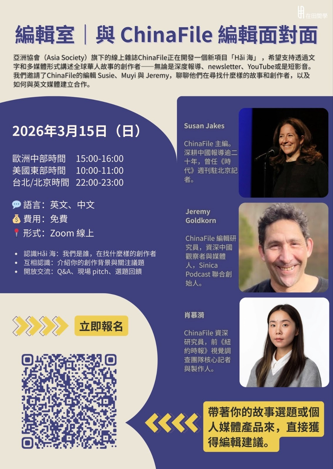 過完農曆新年,《田間》「馬」不停蹄地準備精采文章內容,還有豐富的「在田間學」線上活動,而在3月15日的活動,《中參館》(China File)編輯群會來聊聊,他們尋找怎樣的故事與創作者,歡迎報名參加。