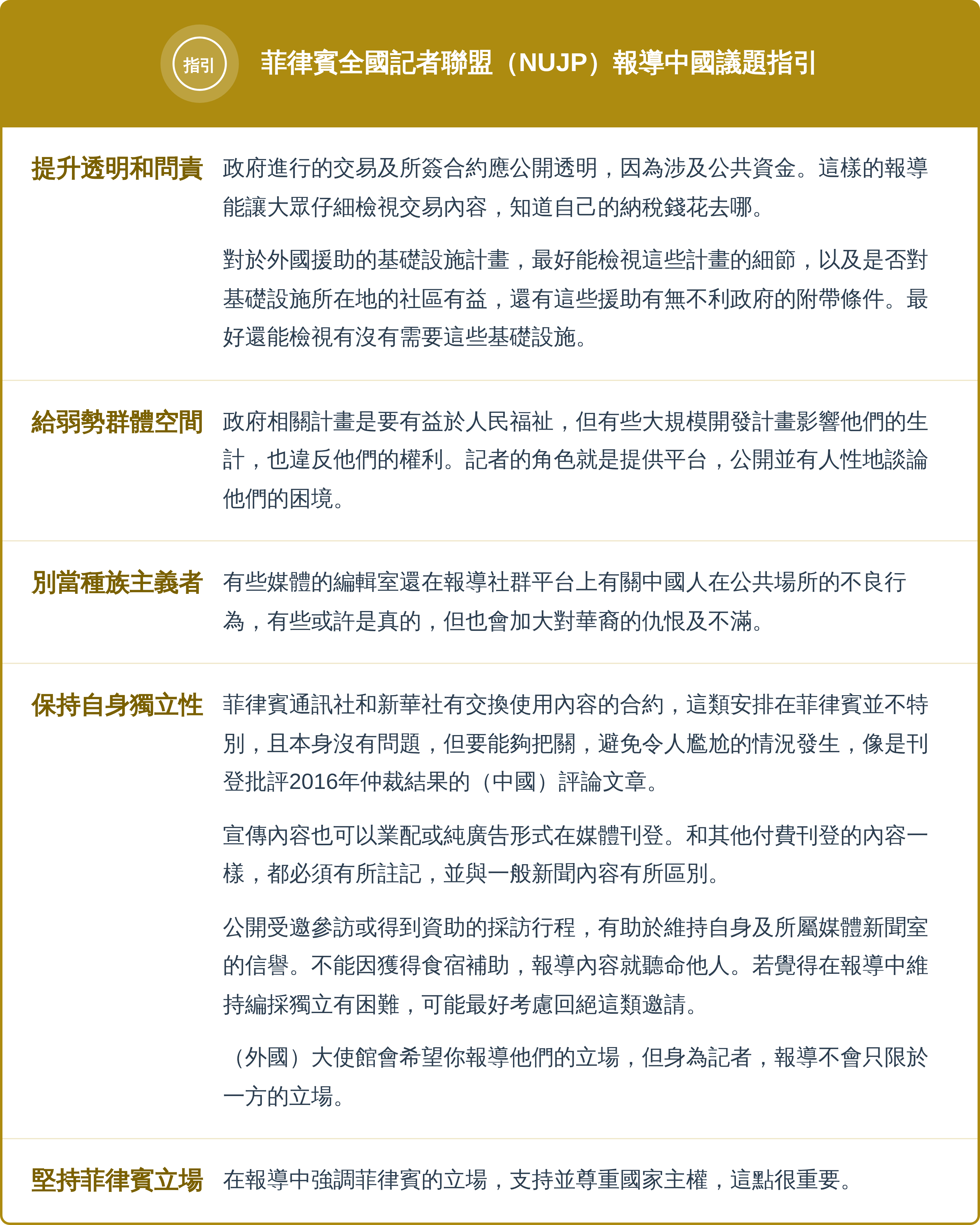 Regine Cabato也在文中表示,菲律賓全國記者聯盟(NUJP)有發布報導中國議題的指引。