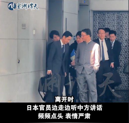 2025年底發生的中日爭端中,中國媒體和外交系統發出許多奇怪言論。例如2025年11月18日,中國外交部亞洲司司長劉勁松,面對日本外務省亞洲大洋洲局長金井正彰的奇怪表演,在他們會面結束時,劉故意面對金兩手插兜,做出高傲的姿態,完全拋棄外交場合的禮貌和尊重,只為了讓媒體捕捉下這看似「霸氣」的一幕。兩位外交官的見面場合,本來並沒有安排媒體拍攝,因為這不是有媒體發布會的外交活動,但一個簡介為「簡單邏輯看複雜世界」的自媒體「玉淵譚天」,卻在當天發布了上述的現場照片,引發全球譁然,當然在中國國內,人們為外交官的蔑視神情彈冠相慶。