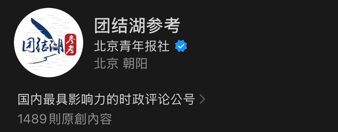 從這些角度,「馬甲號」運營屬性可見一斑。類似的賬號相當多,簡介「但憑俠者仁心,拆解時政迷局」的「俠客島」,實際為《人民日報海外版》的馬甲號;簡介為「提供靠譜的政事分析,解讀注意不到的新聞細節,腦補有趣有料的政治常識。一群接近核心的小編,給你提供走心的時政新聞。」的「長安街知事」,實際為《北京日報》的馬甲號;簡介為「國內最具影響力的時政評論公眾號」的「團結湖參考」(這個號的流量和影響力明顯難當此職),實際為《北京青年報》的馬甲號。這個號的文章質量極低,都是情緒性煽動文章,在網上流量不小,但違背新聞倫理,不是一個國家級官方媒體應該發布的內容。即便只是黨的新聞機器,他們也嘗試保持基本的體面。