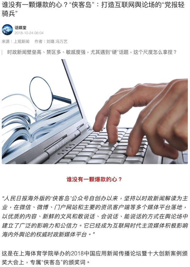 從一篇2016年的中央網絡安全和信息化委員會辦公室(網信辦)文章《從「俠客島」看國家聲音的微表達》就能看到這種內容生態。這篇文章是這樣說的,「俠客島」是來自《人民日報海外版》總編室、記者部和新媒體部的五名年輕記者自發創辦,以兼職形式,在下班後寫作和運營──這當然沒有任何可能──中國歷來嚴控官方人員兼職行為,根據《事業單位工作人員處分規定》,在兩處以上事業單位任職或未經批准在企業兼職的,屬於違規行為,情節嚴重可予以開除。國家新聞出版署正在進行第七版新聞記者證的全國統一換發工作(2024年底至2025年初),這次換證有一項核心的審核指標,就是「清查違規兼職」。