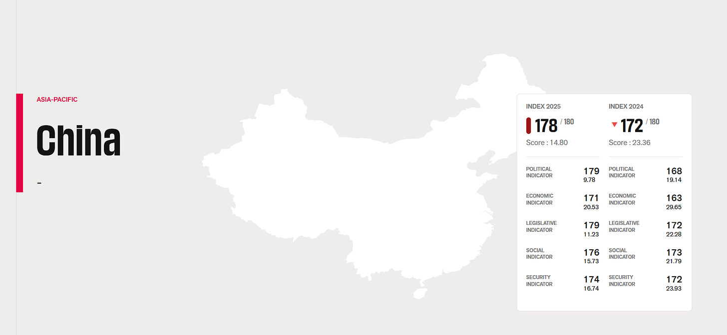 總部位於法國巴黎的無國界記者組織(RSF)發佈的《2025年世界新聞自由指數》(World Press Freedom Index)顯示,中國排名下降六位,在180個國家中排名第178,仍是全球關押記者人數最多的國家,目前有123名記者被羈押。此外,香港排名也跌至第140,同樣歸入「狀況惡劣」類別。
