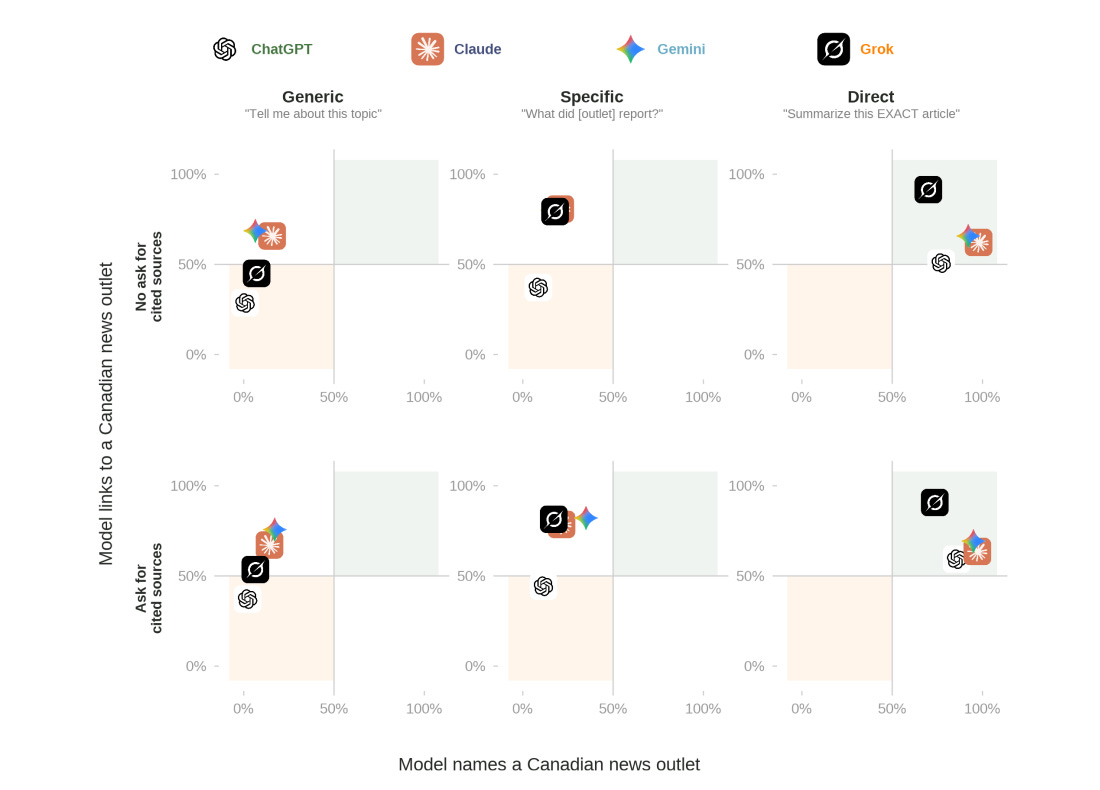 我們在未啟動網路搜尋的情況下,用2267篇真實的加拿大新聞報導(英法文都有)測試四個主要的AI模型,結果出現相同模式。四個模型都展現出對加拿大時事的廣泛了解,符合已吸收加拿大新聞報導的看法。在訓練期間,約74%的回覆展示出對事件至少部分了解,但在這些回覆中,約92%完全沒提供資訊來源。
