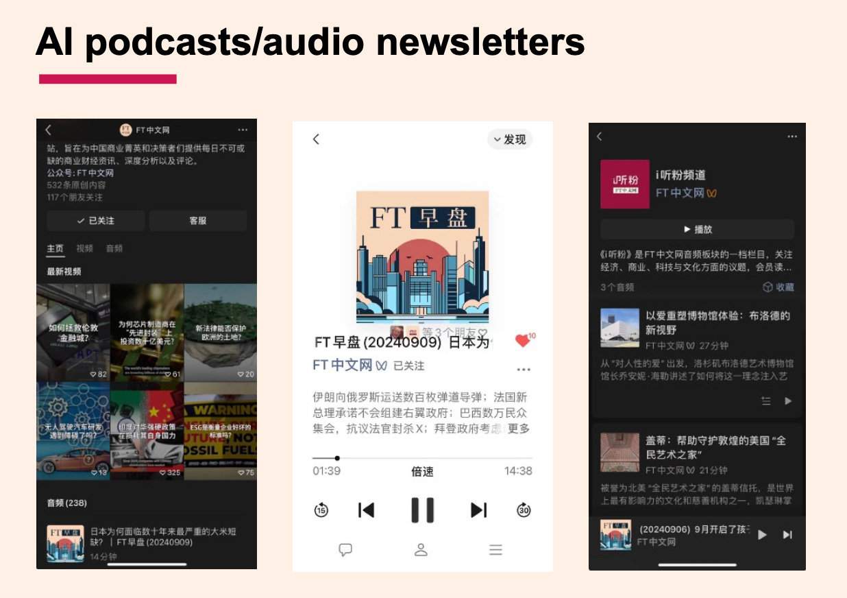 關於AI應用新聞產品,我們FT中文現在已經大量做的是用AI做語音摘要。比如說用AI將2000字的文章摘要成200字,然後用AI聲音讀出來,每天通過微信發給讀者。這可以讓一些開車的人、通勤的人,通過耳機能聽這篇文章。